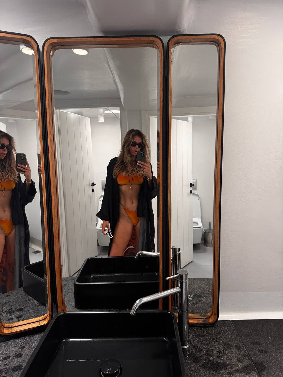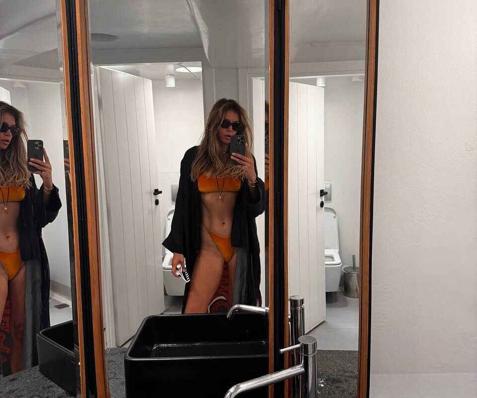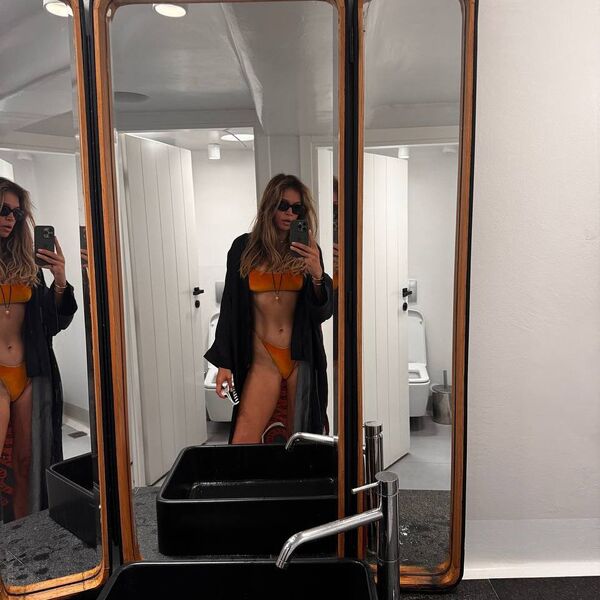 43-летняя Вера Брежнева стояла перед зеркалом в оранжевом бикини, которое дополнила черной накидкой и солнцезащитными очками. Певица также надела цепочку с кулоном и золотые браслеты. Поп-исполнительница была запечатлена с распущенными волосами и без макияжа.
