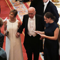 В апреле 67-летняя Елена Жукова и 94-летний Руперт Мердок появились на 11-й церемонии вручения премии Breakthrough Prize, которая состоялась в Санта-Монике. Бывшая теща Романа Абрамовича позировала на красной дорожке в темно-синем платье с открытыми плечами, массивных серьгах, браслете и с серебристой сумкой. Ей сделали укладку и вечерний макияж с розовой помадой. Медиамагнат вышел в свет в белой рубашке с галстуком, черном брючном костюме и кроссовках.