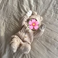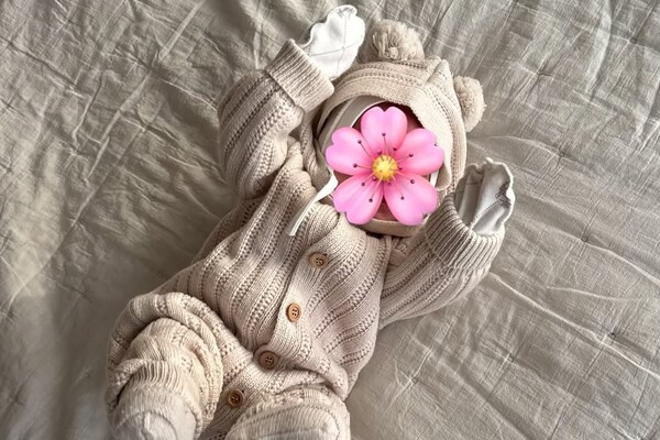 На снимке Эмма была запечатлена в бежевом вязаном костюме с капюшоном, пинетках, шапке и рукавичках. Новорожденная дочь Валентины Ивановой и Тимати лежала на кровати. Модель скрыла лицо ребенка смайликом в виде цветка.
