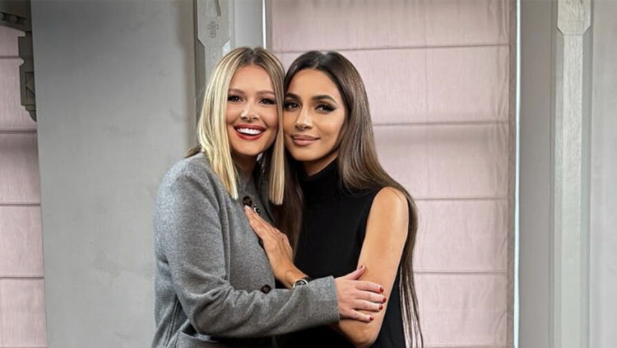 Мария Кожевникова позировала в серых облегающих брюках и жакете в тон. Волосы ей выпрямили и сделали макияж с красной помадой. В кадре она обнимала певицу Зару.