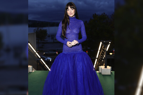 Дакота Джонсон появилась на мероприятии в ярко-синем платье с облегающим прозрачным верхом и пышной юбкой, отказавшись от бюстгальтера. Волосы ей распустили и сделали вечерний макияж с угольно-черными стрелками и подводкой.