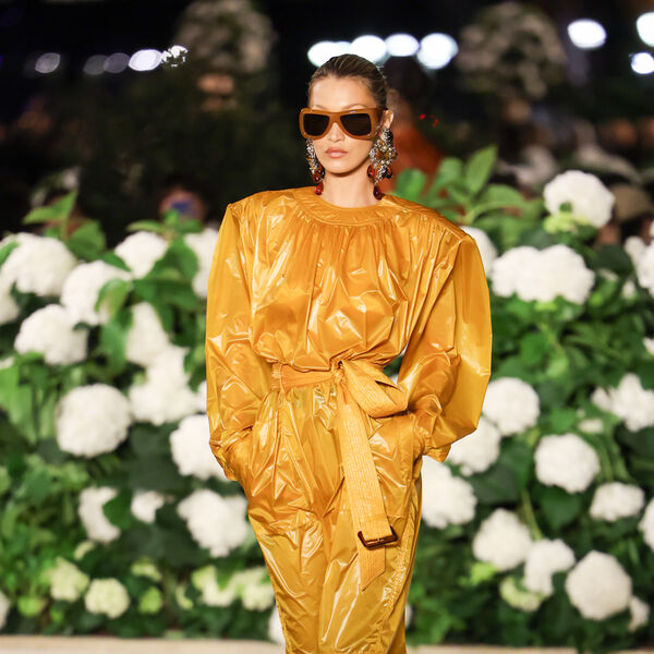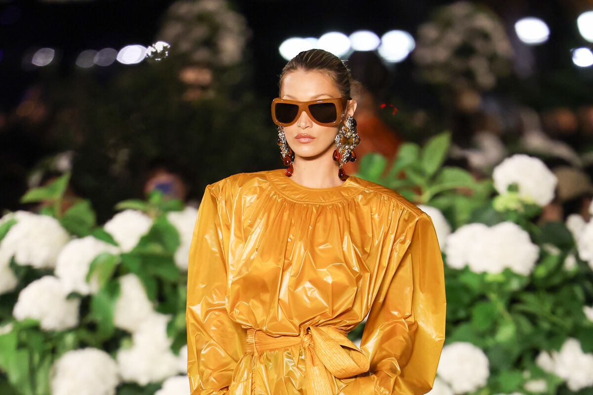 28-летняя Белла Хадид появилась на подиуме в желтом комбинезоне, коричневых колготках и солнцезащитных очках. Волосы ей уложили в низкий пучок и сделали акцентный макияж.