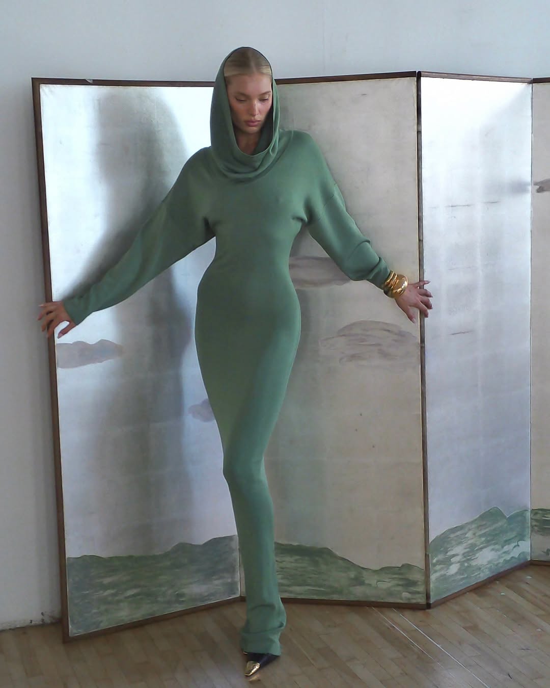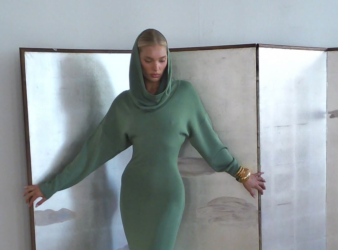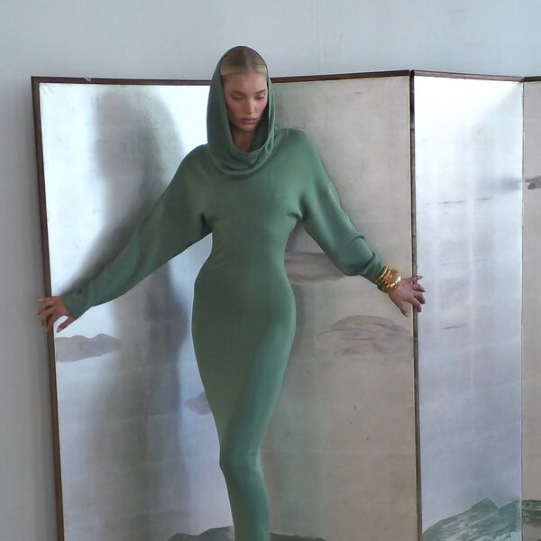 Эльза Хоск снялась в облегающем зеленом платье без нижнего белья и с капюшоном. Образ дополнили золотые браслеты и туфли с острым мысом. Однако пользователи соцсетей не оценили платье.