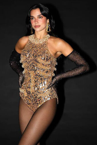 Певица Дуа Липа снялась в золотом боди и сетчатых колготках