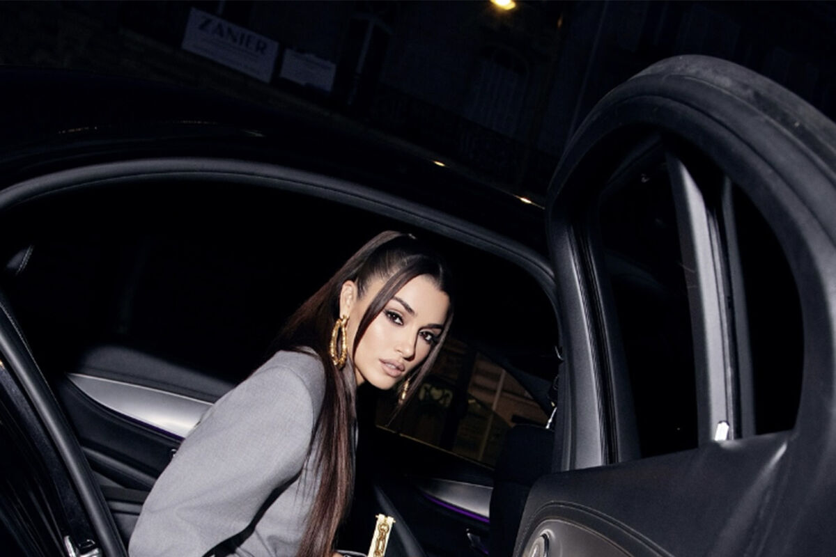 Ханде Эрчел позировала в сером мини-платье, которое дополнили акцентные розовые перчатки, золотые серьги и туфли на платформе. Волосы ей уложили крупными локонами и сделали вечерний макияж.