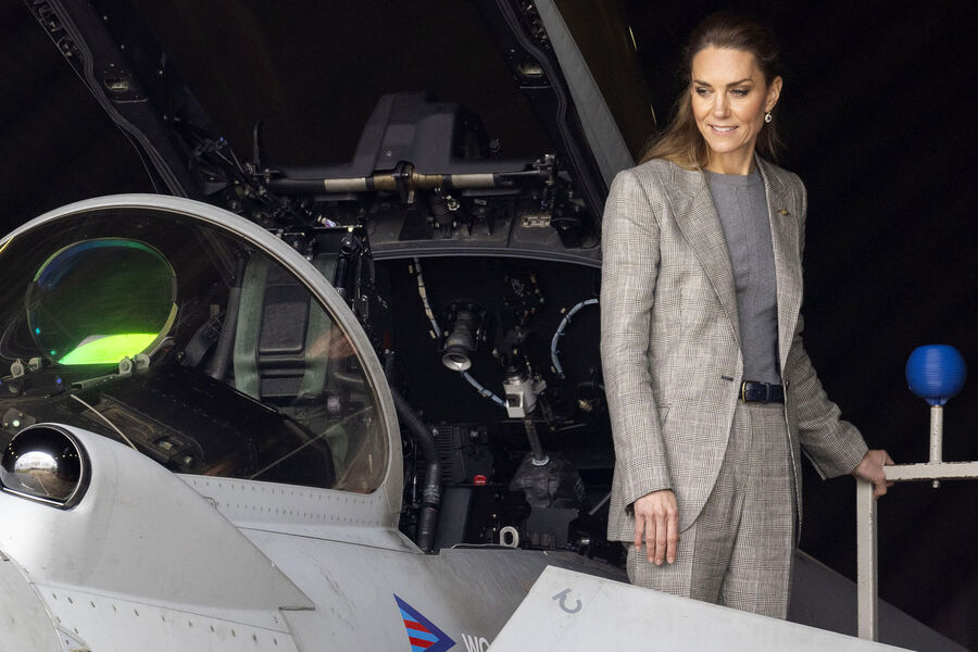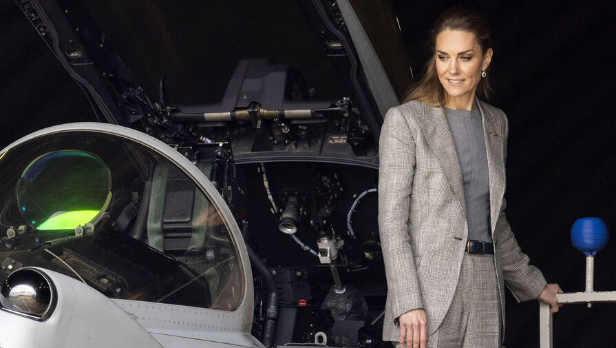 Принцесса Кейт Миддлтон в сером костюме посетила базу Королевских ВВС Великобритании. Об этом сообщает People.