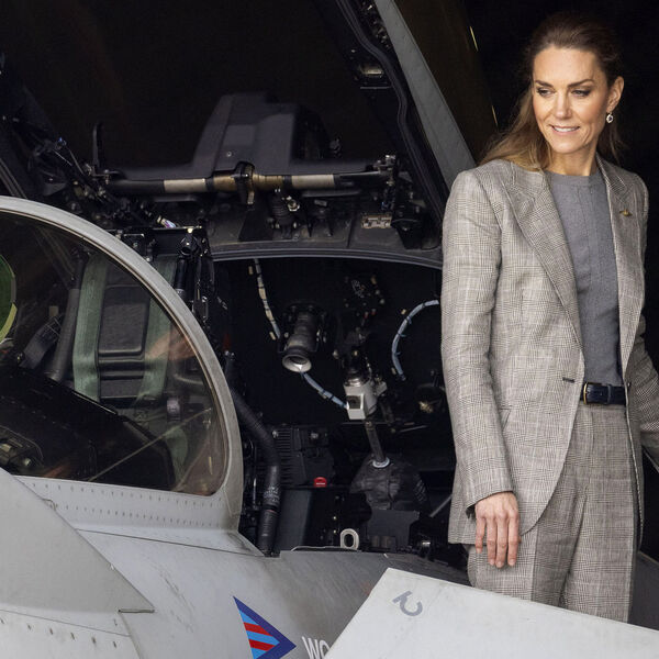 43-летняя принцесса Уэльская появилась в приталенном сером костюме в клетку от бренда Bella Freud. Образ дополнили серый топ Alexander McQueen, туфли на высокой шпильке, серьги с сапфирами и бриллиантами из коллекции принцессы Дианы и золотая брошь в виде крыла ВВС. Кейт Миддлтон заглянула в новый учебный центр, где ей предложили испытать авиасимулятор полетов.
