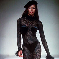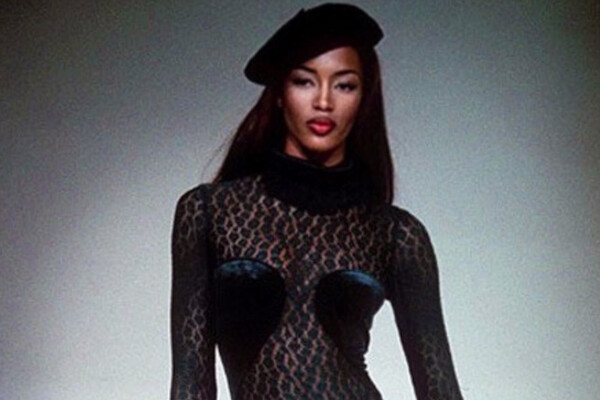 55-летняя Наоми Кэмпбелл позировала в «голом» комбинезоне из черного кружева на подиуме во время показа в 1991 году. Образ дополнила шляпка. Волосы ей выпрямили и сделали макияж с красной помадой.