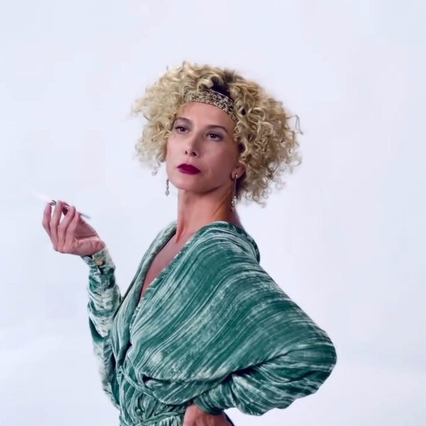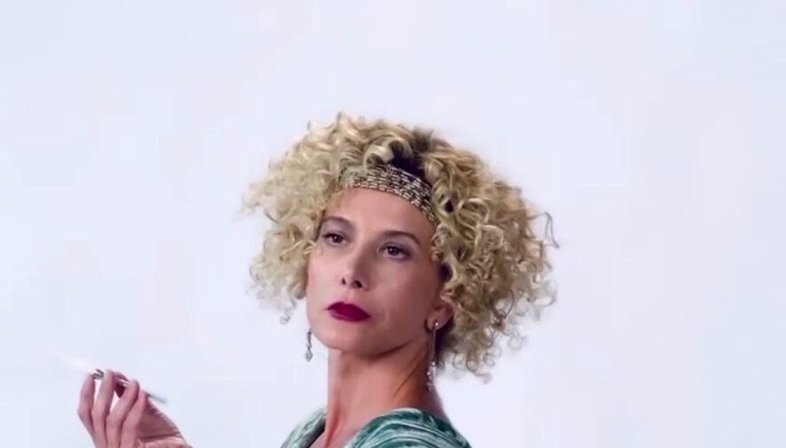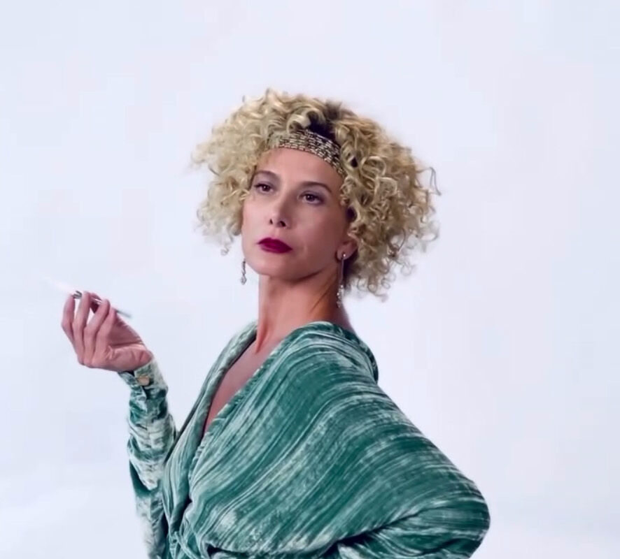 52-летняя Юлия Высоцкая позировала с мелкими короткими кудрями и макияжем с красной помадой и фиолетовыми тенями. Актриса также была одета в лазурное бархатное платье с глубоким декольте.