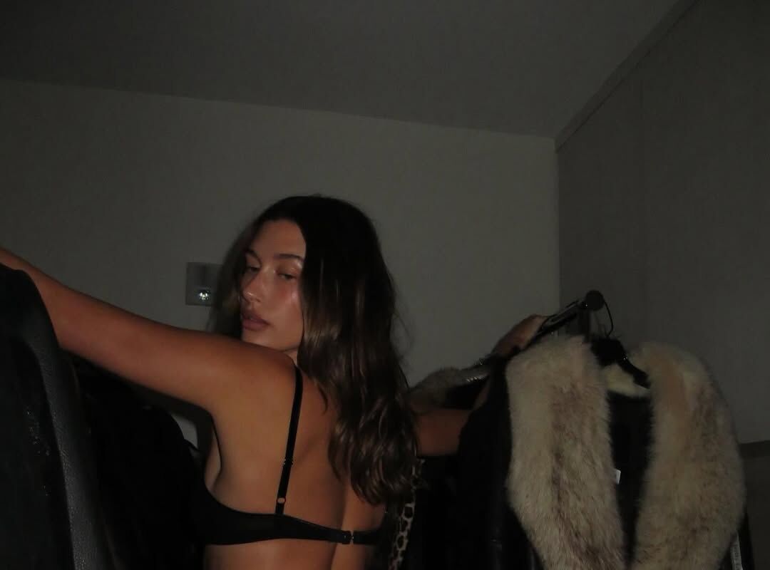 31-летняя Хейли Бибер предстала перед камерой в черном комплекте белья. Модель была запечатлена с уложенными распущенными волосами и макияжем. Манекенщица стояла в гардеробной.