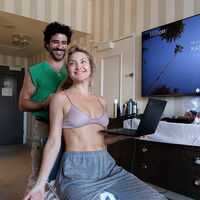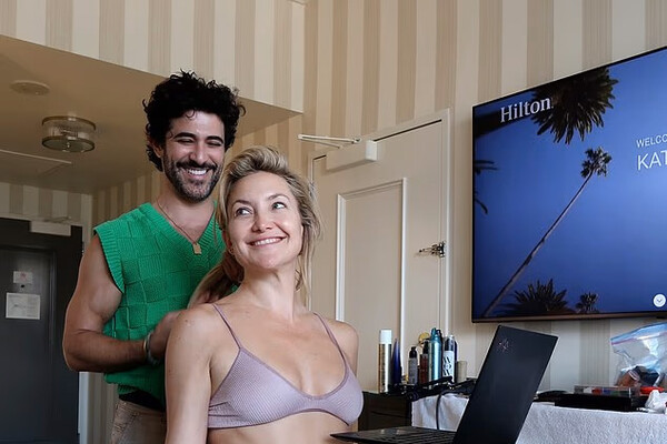 46-летняя Кейт Хадсон предстала перед камерой в розовом бюстгальтере и серых пижамных штанах. Актриса была запечатлена без косметики с ноутбуком в руке. Стилист укладывал знаменитости волосы.