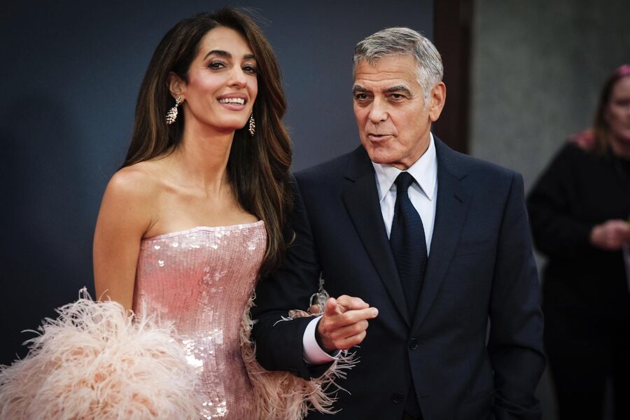 64-летний Джордж Клуни в классическом костюме и рубашке вышел на публику с 47-летней женой Амаль в розовом платье Tamara Ralph со стразами и перьями. Волосы Амаль Клуни уложили мягкими локонами и сделали макияж с угольно-черными стрелками и розовой помадой.
