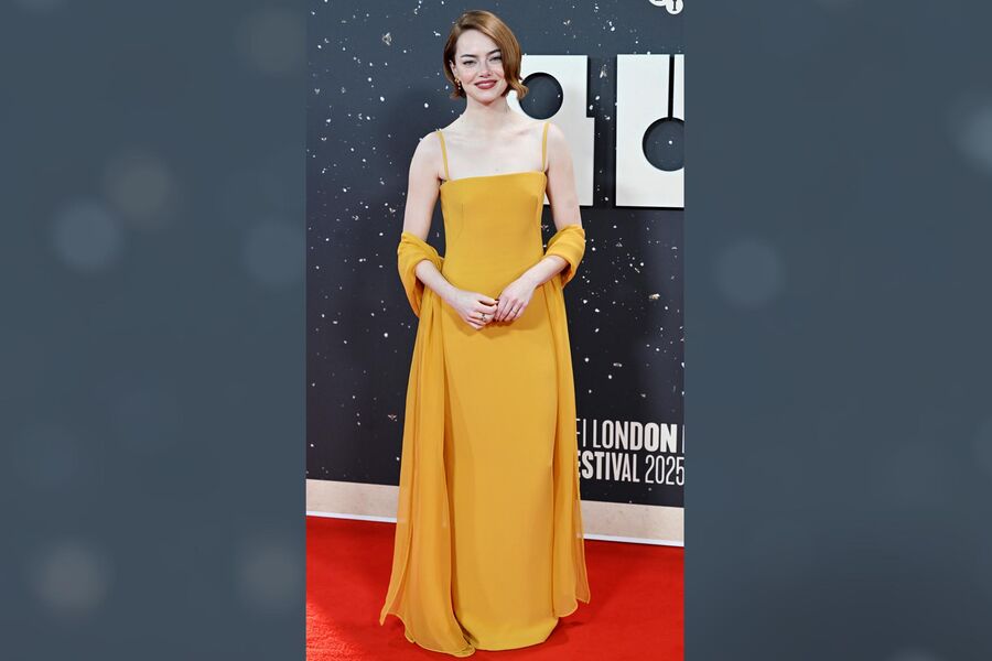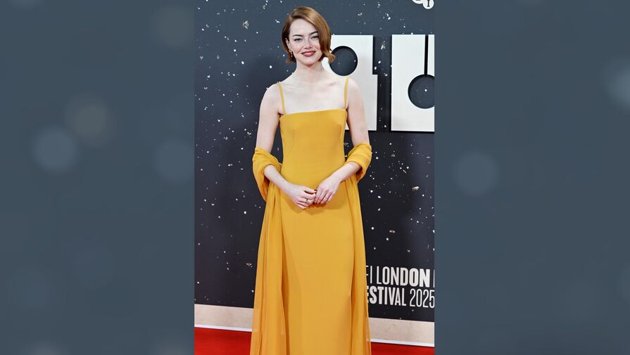 Эмма Стоун позировала в желтом платье-комбинации с разрезом до бедра и накидкой в тон. Волосы актрисе уложили волнами и сделали макияж с бордовой помадой.