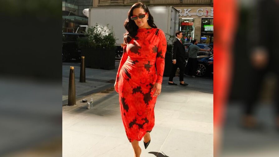 Эшли Грэм позировала в красном облегающем платье с пестрым принтом. Образ модель дополнила узкими очками и туфлями с острым мысом.