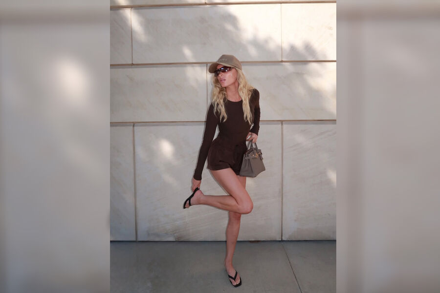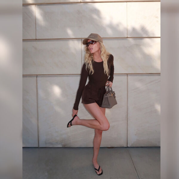 36-летняя Эльза Хоск предстала перед камерой в шоколадном комплекте, который состоял из лонгслива и коротких шортов. Модель добавила к образу солнцезащитные очки, кепку, черные вьетнамки и светло-серую сумку Hermes Birkin. «Ангел» Victoria's Secret уложила волосы в легкие локоны и сделала макияж в естественном стиле с блеском для губ.