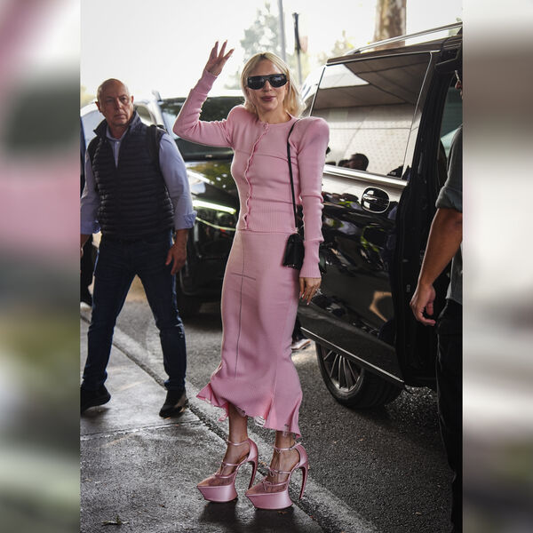 Папарацци засняли Леди Гагу 11 октября около аэропорта Милана. Певица была запечатлена в розовом облегающем кардигане с объемными плечами, юбке-миди и туфлях на экстремальных кривых каблуках с бантами. Поп-исполнительница добавила к образу солнцезащитные очки и сумку на плечо. Знаменитости уложили волосы и сделали макияж с темно-розовой помадой.