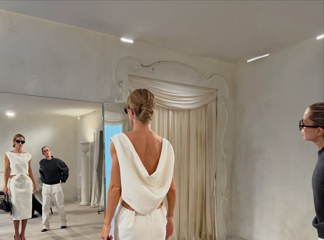 В начале октября Рози Хантингтон-Уайтли выложила в личном блоге фото, где стояла перед зеркалом в белом облегающем боди с длинными рукавами и бежевых туфлях на каблуках. При этом супермодель не стала надевать штаны. Манекенщица позировала с уложенными в локоны волосами. Звезда подиумов была запечатлена в фотостудии.