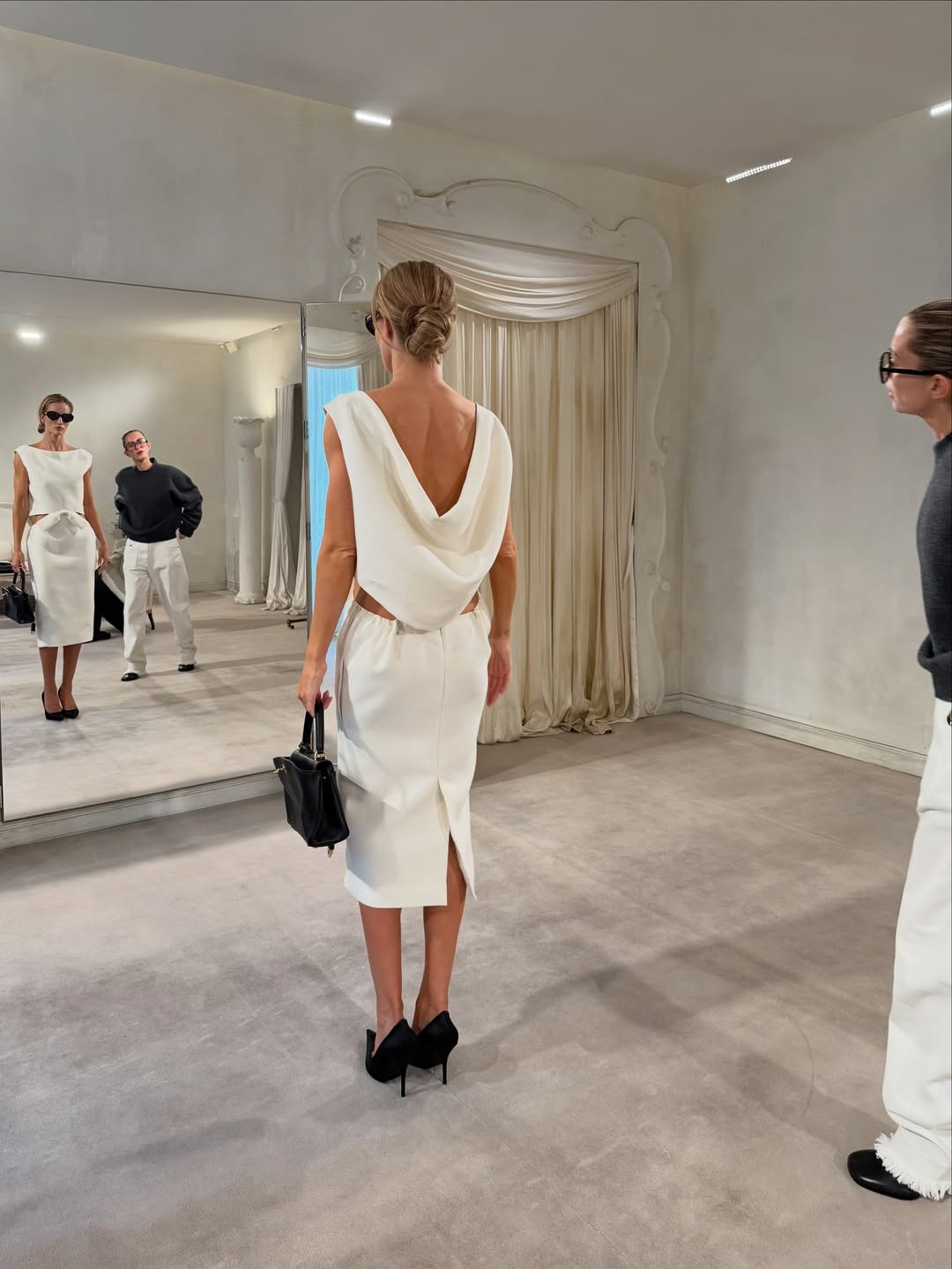 Рози Хантингтон-Уайтли показала кадры, сделанные во время Недели моды в Париже. На одном из фото модель предстала в белом костюме, который состоял из топа с вырезом на спине и юбки. Манекенщица также надела черные туфли на каблуках и солнцезащитные очки. Образ звезды дополнила кожаная сумка. Ей собрали волосы в низкий пучок и сделали макияж.