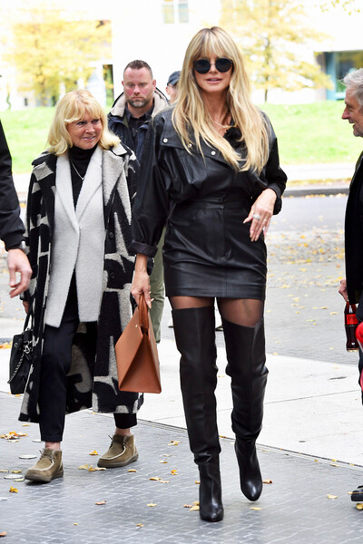 52-летнюю Хайди Клум заметили во время съемок шоу «Топ-модель по-немецки» в Берлине. Супермодель была запечатлена в кожаной куртке, мини-юбке, капроновых колготках и ботфортах на каблуках. Манекенщица дополнила образ коричневой сумкой, солнцезащитными очками и кольцами. Знаменитости уложили распущенные волосы и сделали макияж.