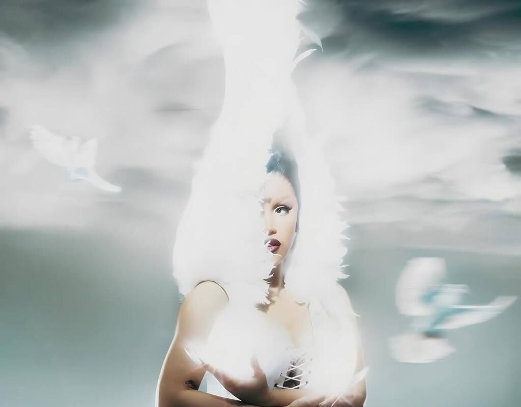 Карди Би примерила наряд для журнала Paper Magazine. Рэперша предстала перед камерой в белом макси-платье со шнуровкой и полупрозрачной юбкой, украшенным перьями.