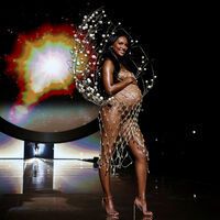 Жасмин Тукс, находящаяся на девятом месяце беременности, открыла шоу Victoria's Secret. Супермодель вышла на подиум в телесном бюстгальтере и стрингах, поверх которых надела золотую цепочку. Образ манекенщицы дополнили босоножки на каблуках и проволочный каркас в форме ракушки. Знаменитости уложили распущенные волосы в локоны и сделали макияж в нюдовых тонах.