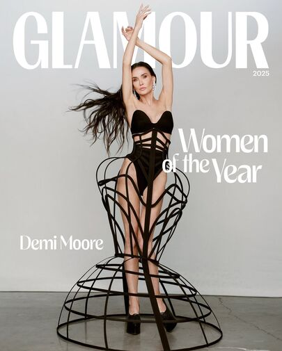 62-летняя Деми Мур стала героиней нового выпуска журнала Glamour. На обложке актриса предстала в черном каркасном платье, под которое надела белье. Артистка добавила к образу массивные серьги с бриллиантами и туфли на высокой платформе. Знаменитости уложили распущенные волосы и сделали макияж с бежевыми сияющими тенями и розовой помадой. Артистку назвали одной из «Женщин года» журнала. Автором съемки выступил фотограф Томас Уайтсайд.