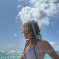 Александра Бортич предстала перед камерой в бело-голубом бикини с цветочным принтом. Актриса также надела солнцезащитные очки. Знаменитость позировала с мокрыми распущенными волосами на фоне моря.