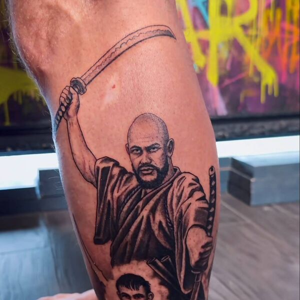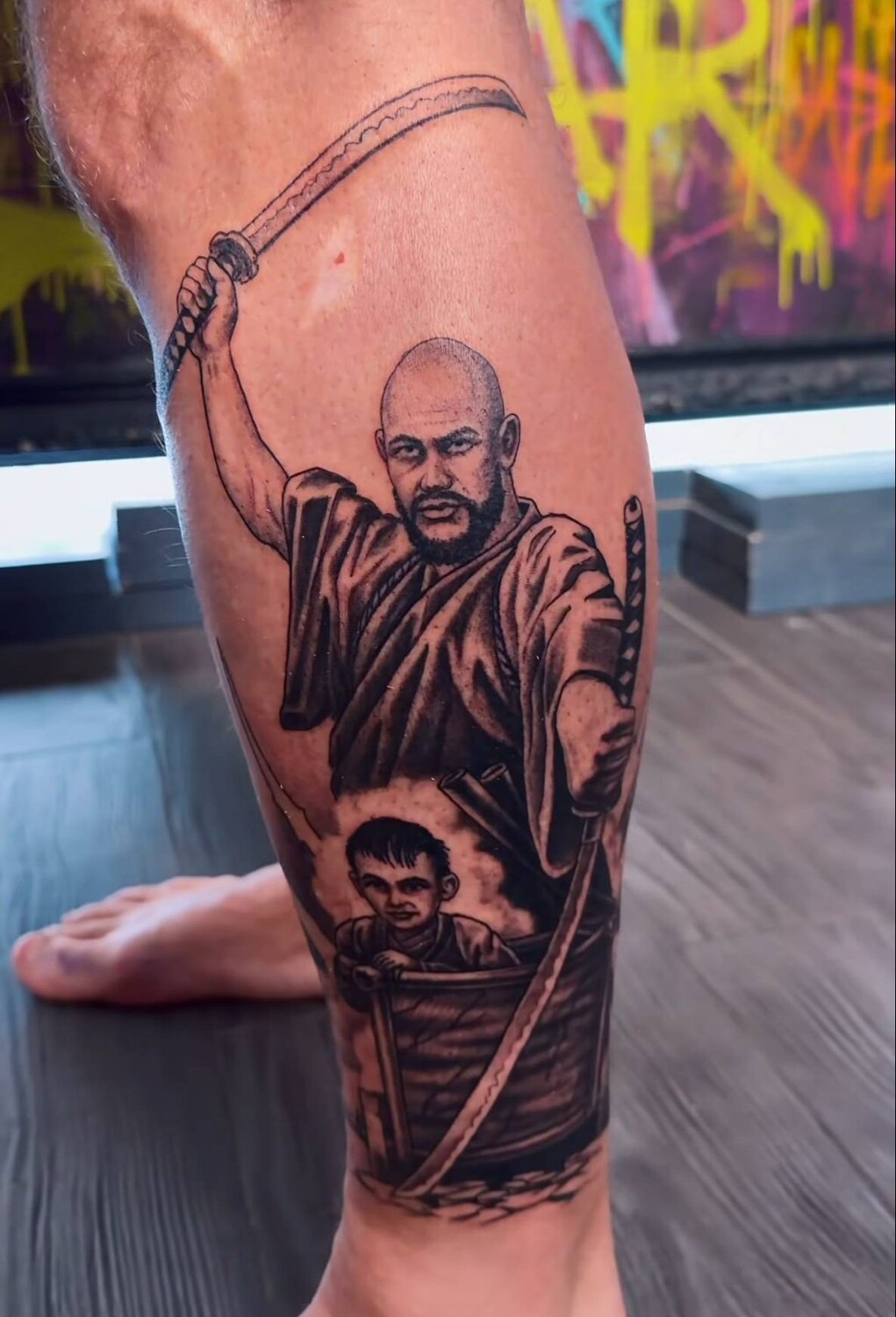 Джиган посетил мастера по тату вместе со своим сыном Давидом. Рэперу сделали на ноге татуировку — самурая, который держит в руках мечи. Рядом с исполнителем в костюме война сидел его наследник.