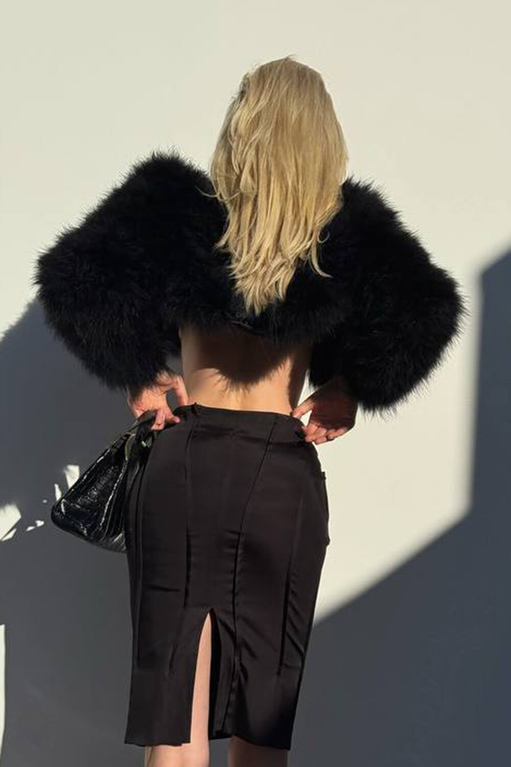 Эльза Хоск снялась в черной облегающей юбке с разрезом, демонстрируя ягодицы, и укороченном топе. Волосы модель распустила и сделала легкие локоны.