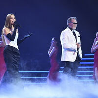 Наталья Подольская позировала в черно-белом корсетном платье. Образ дополнили длинные перчатки и босоножки. Волосы певице выпрямили и сделали вечерний макияж. На сцене она пела вместе с мужем.