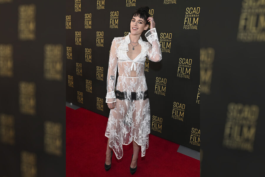 Кристен Стюарт посетила 28-й кинофестиваль SCAD, который прошел 31 октября в Саванне. Актриса вышла на красную дорожку в белом полупрозрачном платье с кружевной вышивкой. Артистка также надела черные трусы, туфли на каблуках и серебристое ожерелье. Знаменитости уложили волосы в высокий пучок и сделали макияж с коричневыми тенями.