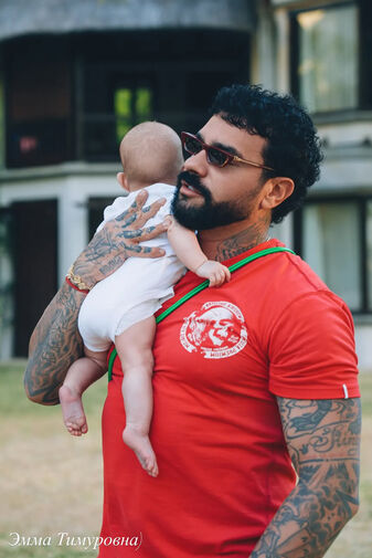 Тимати прижимал к себе дочь, отвернув ее от камеры. Рэпер позировал в красной облегающей футболке и солнцезащитных очках на фоне виллы. Снимок был сделан во время отдыха исполнителя с возлюбленной Валентиной Ивановой и дочерью в тропиках.