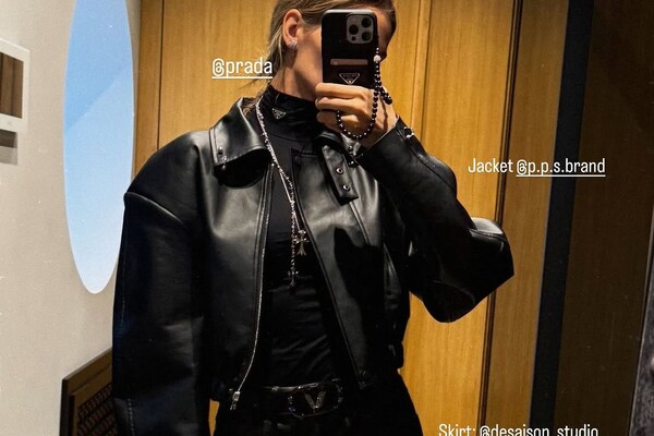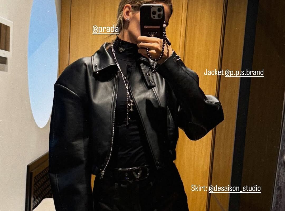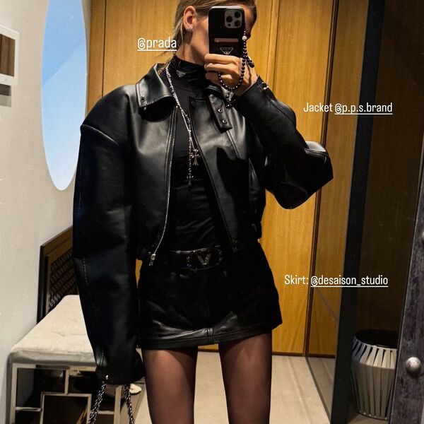Алеся Кафельникова позировала в черной кожаной мини-юбке, бомбере и водолазе. Образ дополнила сумка Chanel, стоимость которой составляет 440 тысяч рублей.