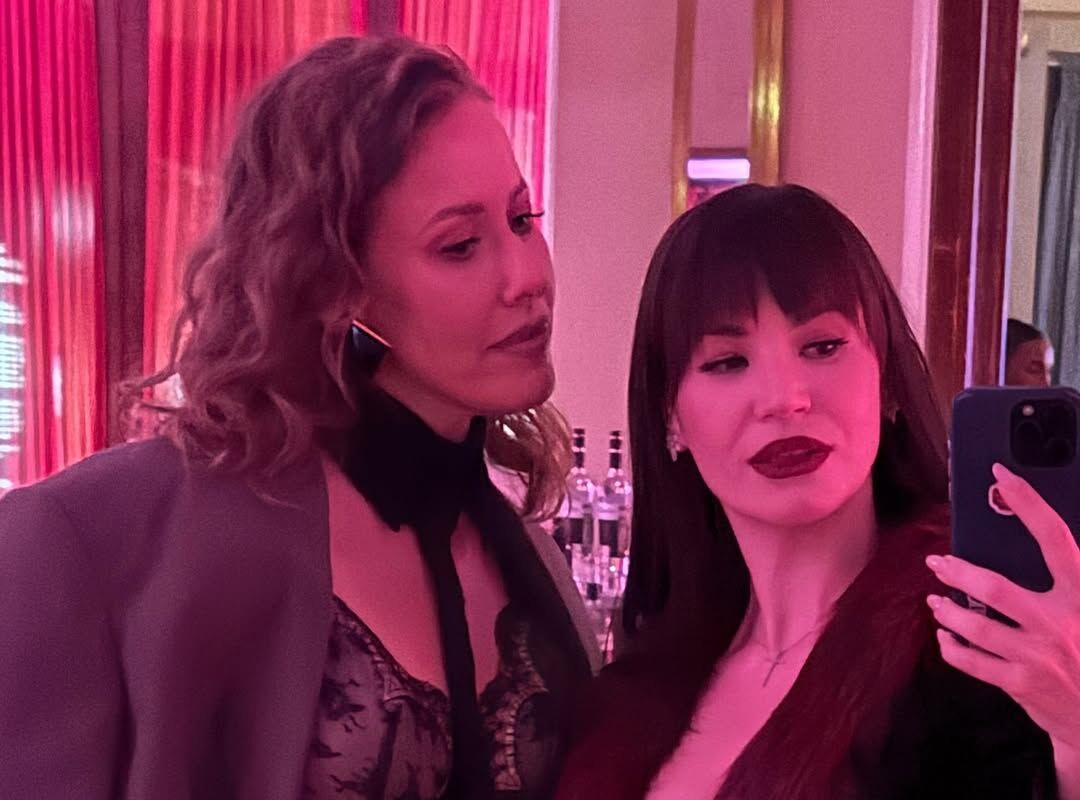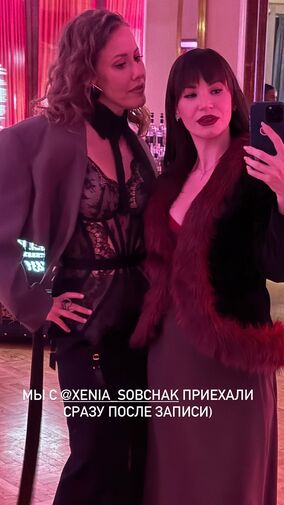 Ксения Собчак позировала в «голом» топе из черного кружева, брюках палаццо и бежевом жакете. Волосы журналистке уложили кудрями и сделали вечерний макияж с угольно-черными стрелками. В зеркале вместе с ней позировала Галич в красной шубе.