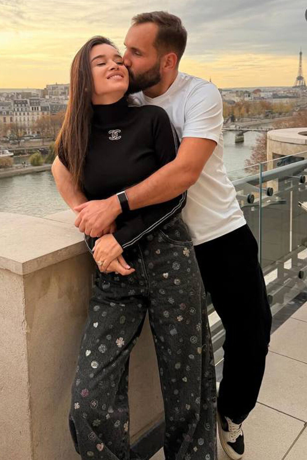 Ксения Бородина позировала в джинcах и водолазе. В кадре ее обнимал муж. Пара стояла на набережной с видом на Эйфелеву башню.