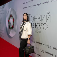 Алика Смехова предпочла для выхода черные брюки, топ и белый жакет. Образ дополнила роза из атласной ленты и сумка из черной кожи. Волосы ей выпрямили и сделали вечерний макияж.