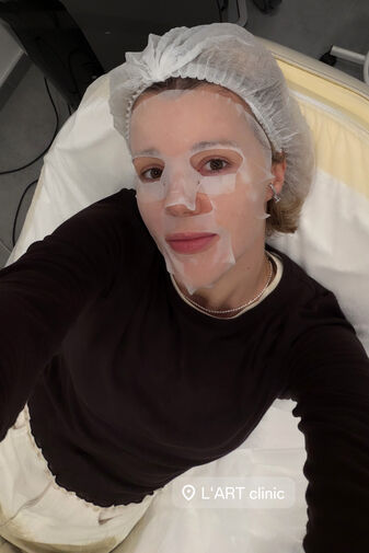 Перед камерой Юлианна Караулова позировала без макияжа и фильтров, нанеся на лицо полупрозрачную маску. Волосы ей скрыли в специальную шапочку.