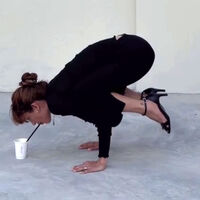 В ролике Дина Саева показала, как встает на руки и пьет воду из стакана с помощью трубочки. Блогерша была одета в черный джемпер, брюки и босоножки на каблуках. Знаменитость собрала волосы в пучок и сделала макияж в нюдовых тонах.