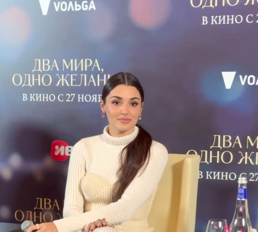 Ханде Эрчел появилась на пресс-конференции в облегающем белом платье. Волосы актриса уложила в хвост и сделала легкий макияж.