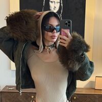 Оксана Самойлова вышла на публику в спущенных зеленых штанах с черными стрингами, бежевом топе и меховой куртке. Образ дополнили очки, ремень и чокер с цепями.