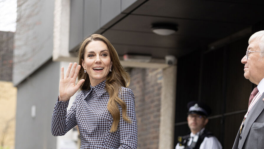 43-летняя Кейт Миддлтон выбрала для выхода платье с принтом «гусиная лапка» от бренда Emilia Wickstead, туфли на каблуке Boss и сумку. Волосы принцессе уложили мягкими локонами и сделали легкий макияж.