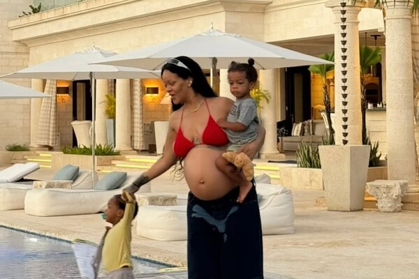 Рианна показала кадры, сделанные на Барбадосе. На одном из фото Рианна была запечатлена вместе с сыновьями на фоне виллы. Певица предстала перед камерой в красном лифе бикини, черных шортах и золотой цепочке. Бизнесвумен стояла с распущенными волосами и без косметики.