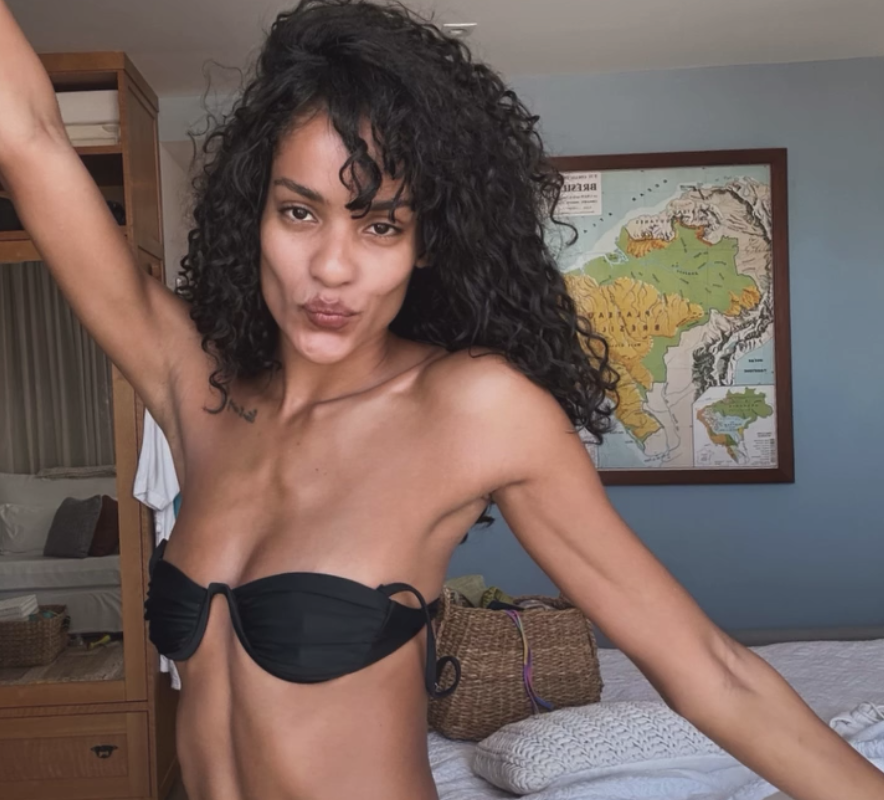29-летняя Нара Баптиста позировала перед камерой в черном бикини на фоне спальни. Модель была запечатлена с распущенными волосами и без косметики.
