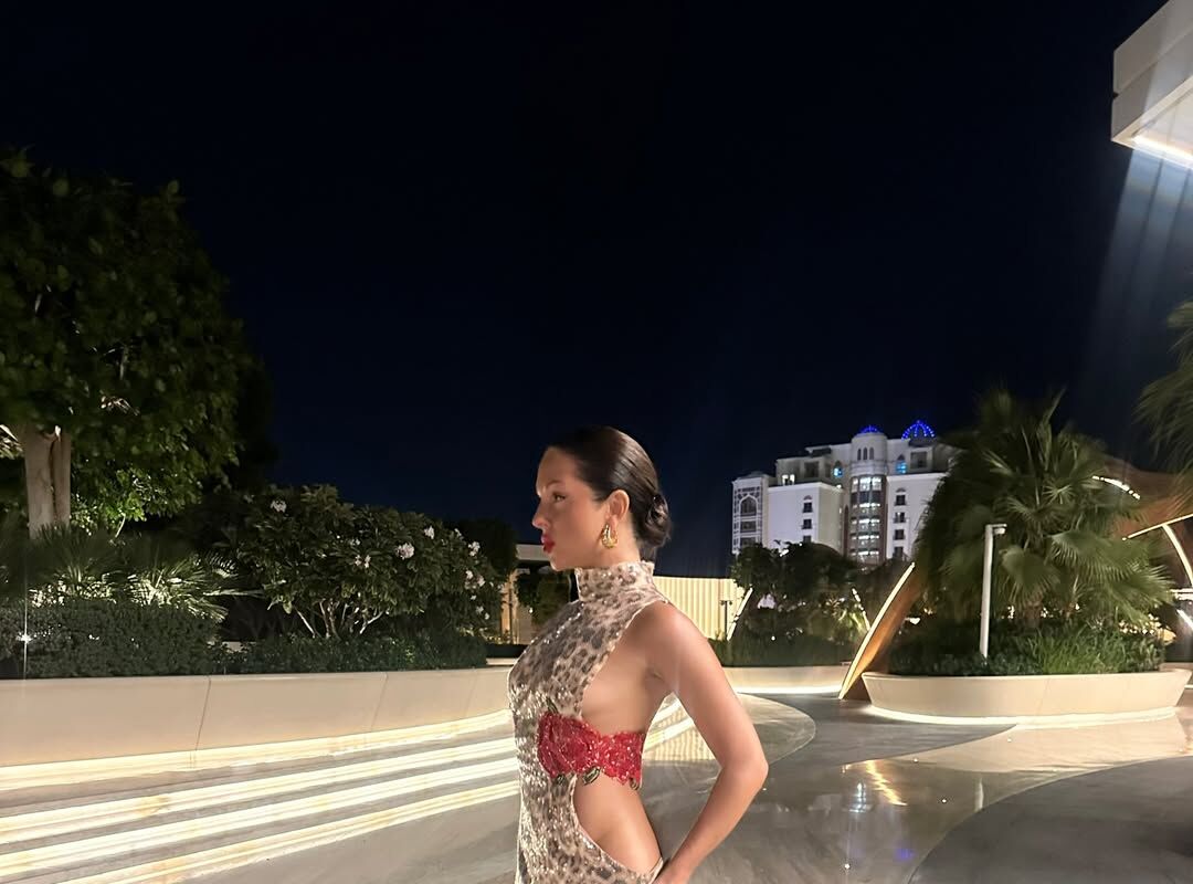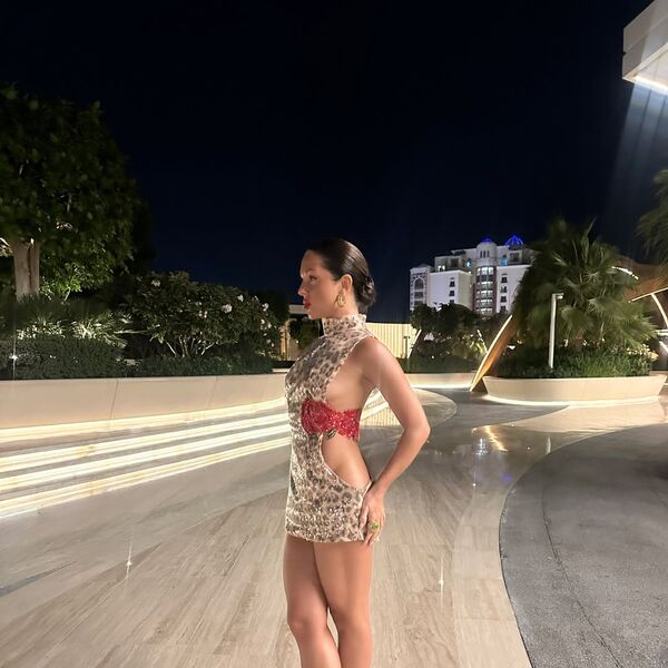 Нюша поделилась кадрами, сделанными во время отдыха в Дубае. На одном из фото певица позировала перед камерой в леопардовом мини-платье с вырезами по бокам, под которое не стала надевать бюстгальтер. Поп-исполнительница добавила к образу черные босоножки на каблуках, массивные золотые серьги и кольцо. Знаменитость собрала волосы в гладкий пучок и сделала макияж с черными стрелками и красной помадой.