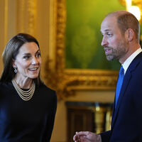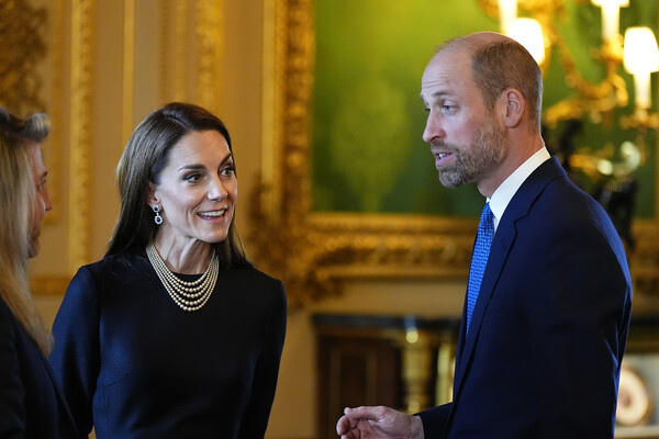 Для выхода Кейт Миддлтон выбрала черное платье, дополнив образ жемчужным ожерельем и серьгами принцессы Дианы. Перед камерами принцесса появилась вместе с принцем Уильямом.