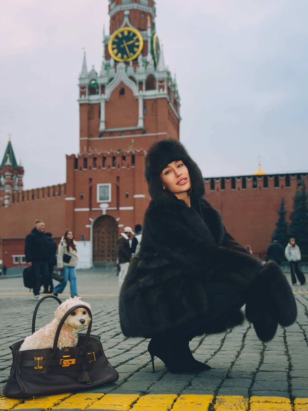 Валентина Иванова позировала в шубе, варежках и шапке-ушанке. Образ дополнила сумка Birkin от Hermes, в которой сидел ее домашний питомец.