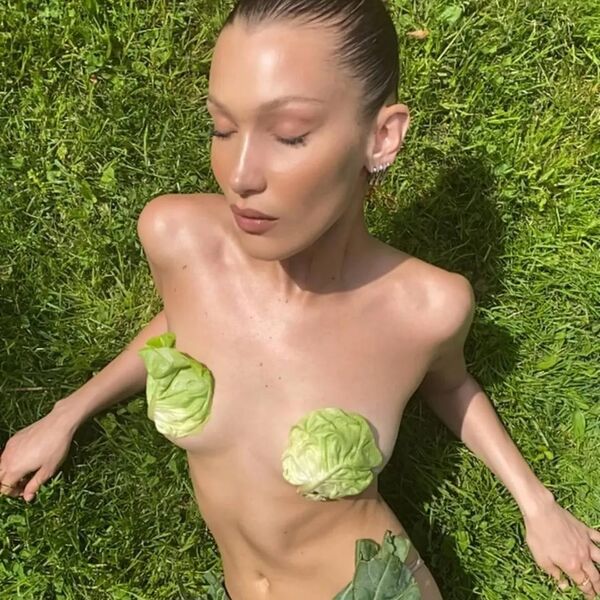 29-летняя Белла Хадид позировала перед камерой, сидя на траве. Супермодель прикрыла тело листьями капусты. Бизнесвумен была запечатлена с уложенными в пучок волосами и макияжем в естественном стиле.