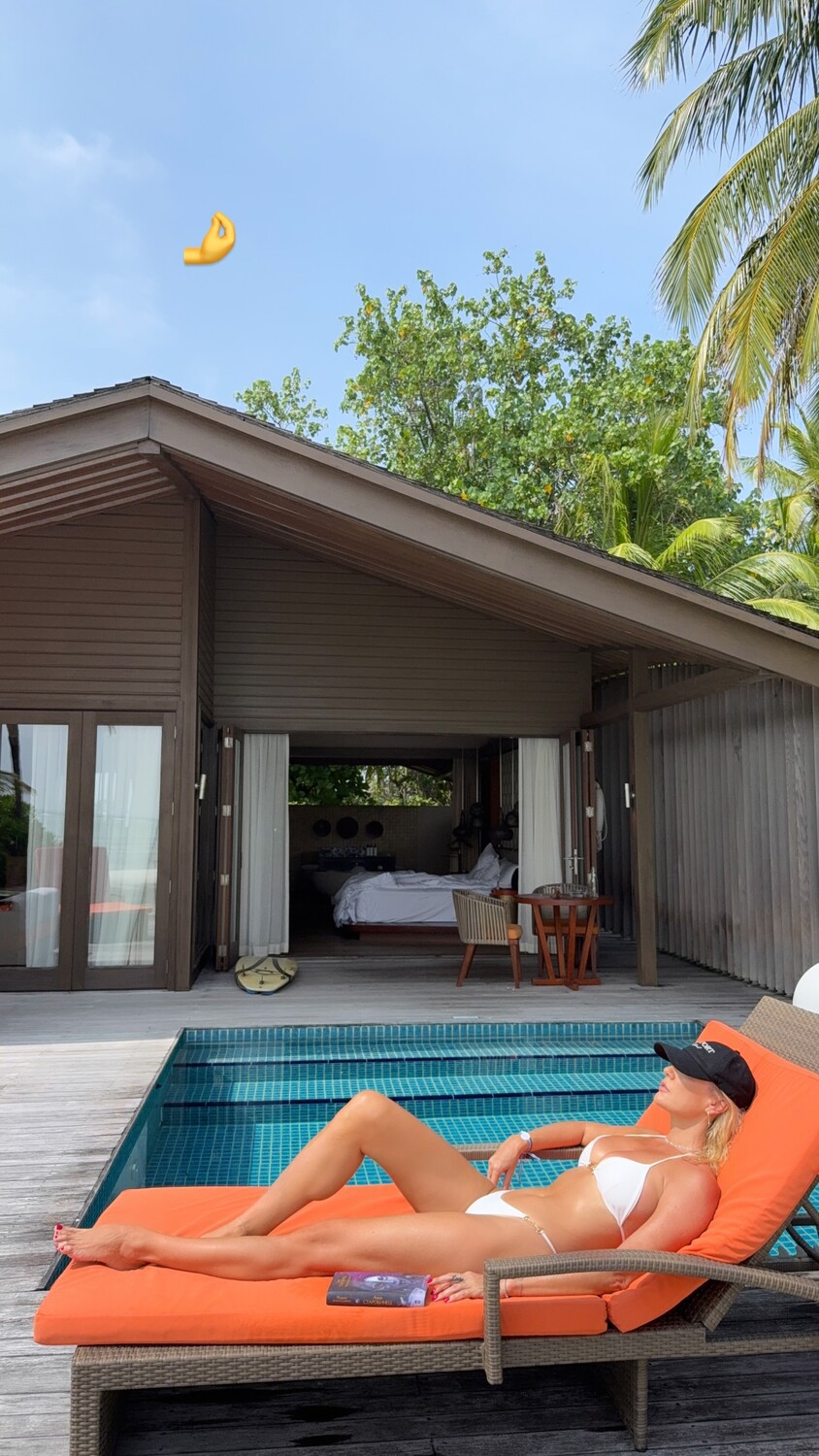Елена Летучая позировала в белом бикини, лежа у бассейна на вилле. Волосы она собрала в пучок и отказалась от макияжа. Ведущая уже несколько дней отдыхает с мужем на Мальдивах.