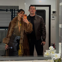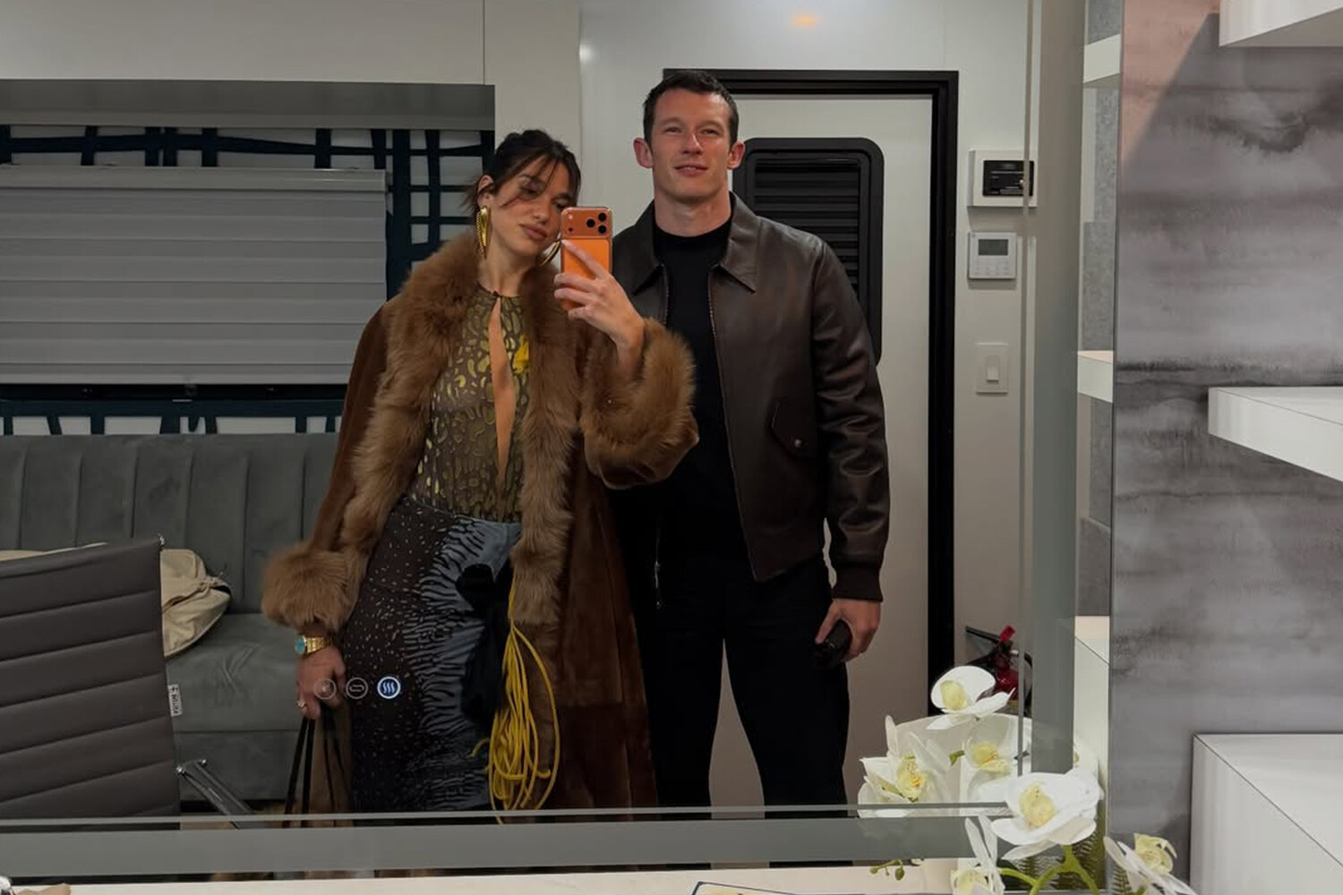 Дуа Липа позировала в юбке, топе и шубе, а ее жених — в кожаной куртке и брюках.