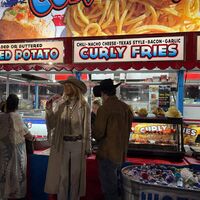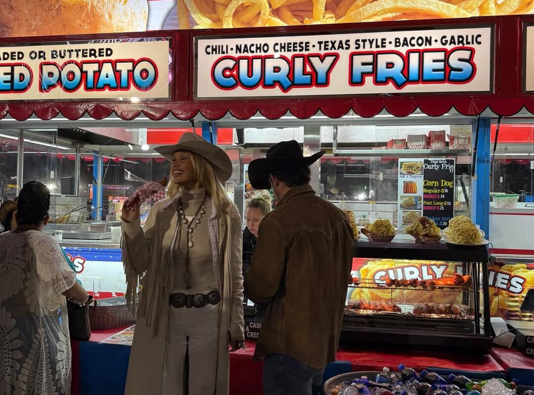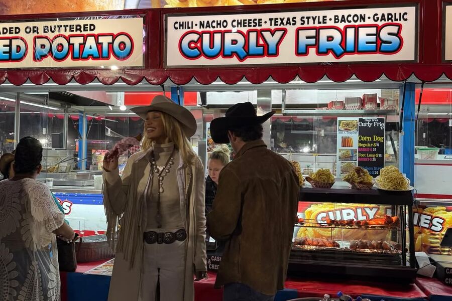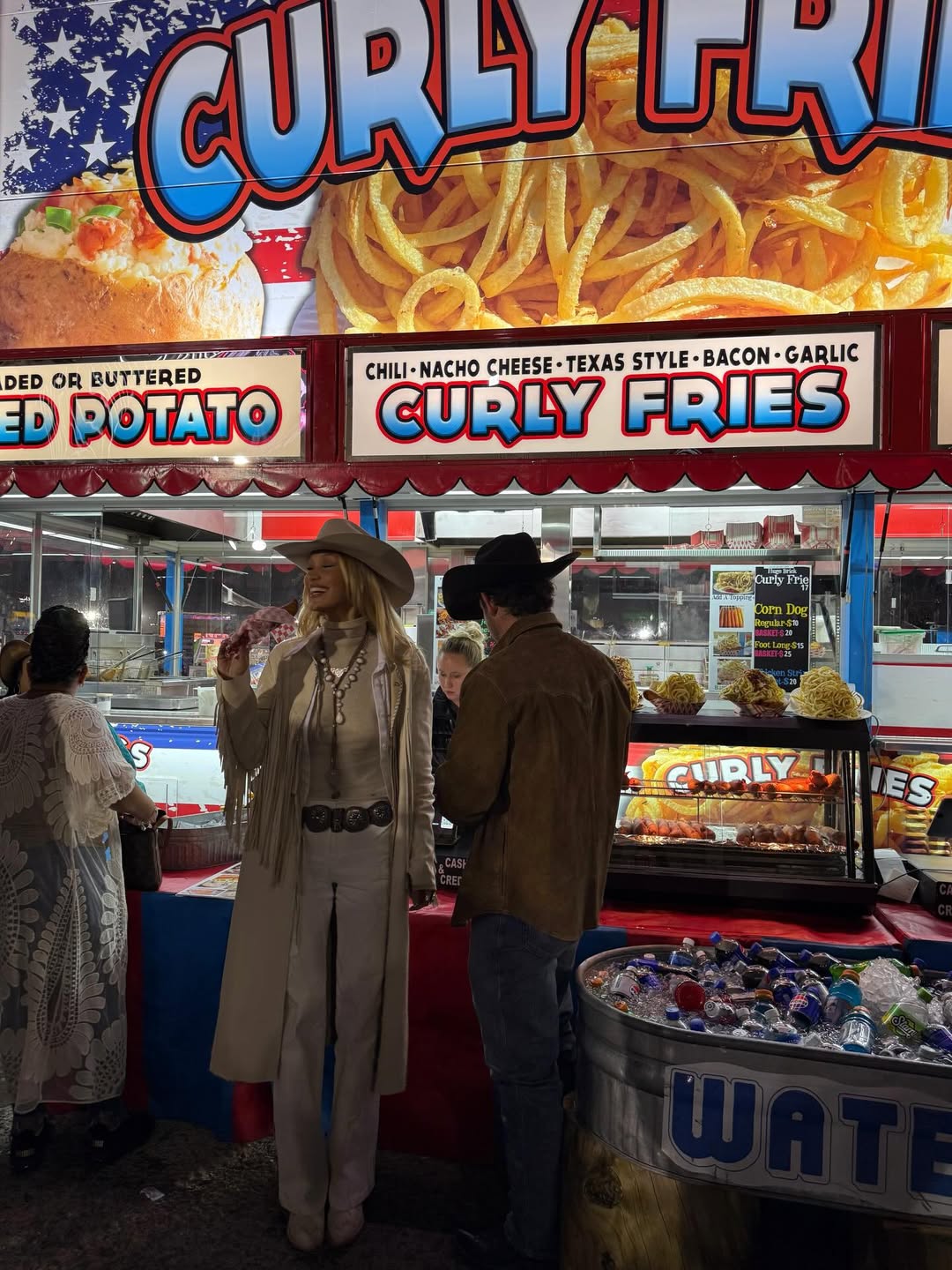 Белла Хадид позировала в молочной водолазке, светлом плаще с бахромой, белых брюках, казаках и шляпе. Модель добавила к образу массивное украшение. Она была запечатлена с распущенными волосами и макияжем в естественном стиле. Рядом стоял ее возлюбленный Адан Бануэлос в ковбойской одежде. Влюбленные покупали фаст-фуд.